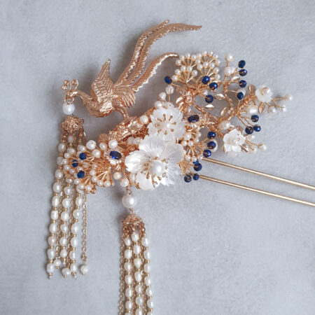 3D Phoenix Flower Hairpin – Gold, Sapphire Rent from Rp1.690.000