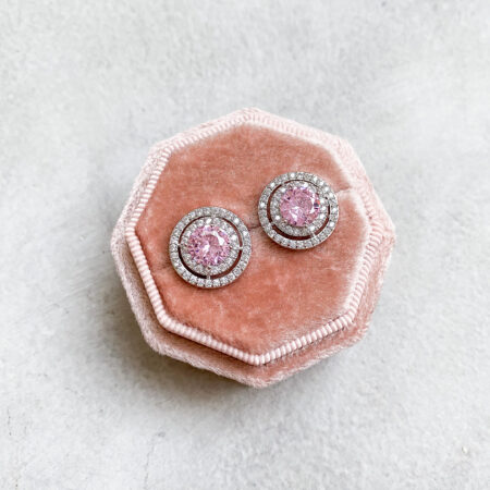 Round Halo with Extra Bezel Earrings – Rhodium White Gold, Pink Diamond Rent from Rp650.000