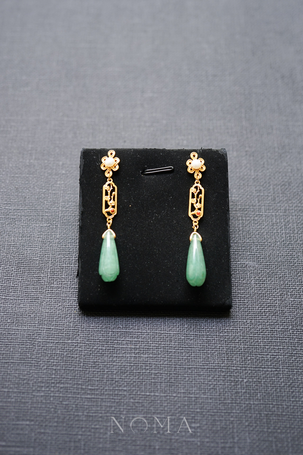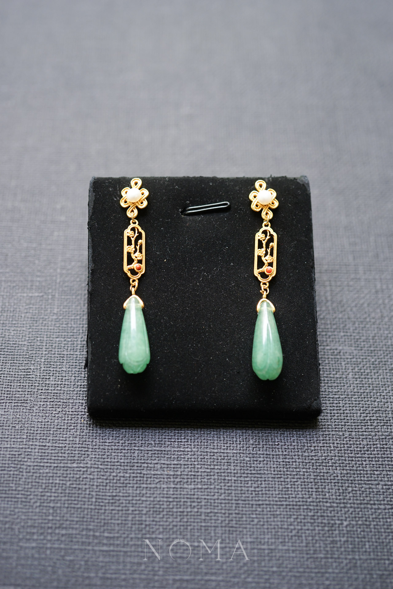 Cherry Blossoms Teardrop Jade Earrings – Gold, Light Jade