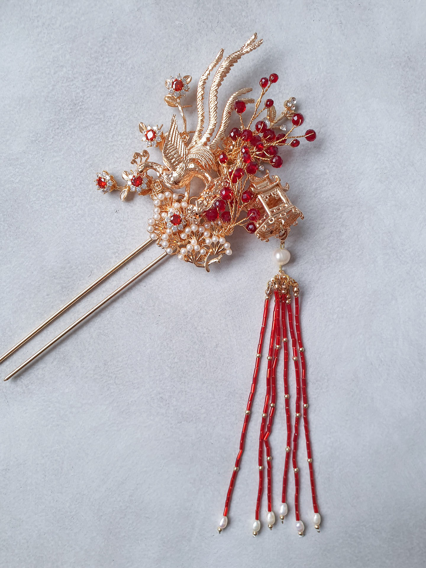 3D Phoenix Pagoda Hairpin – Gold, Ruby