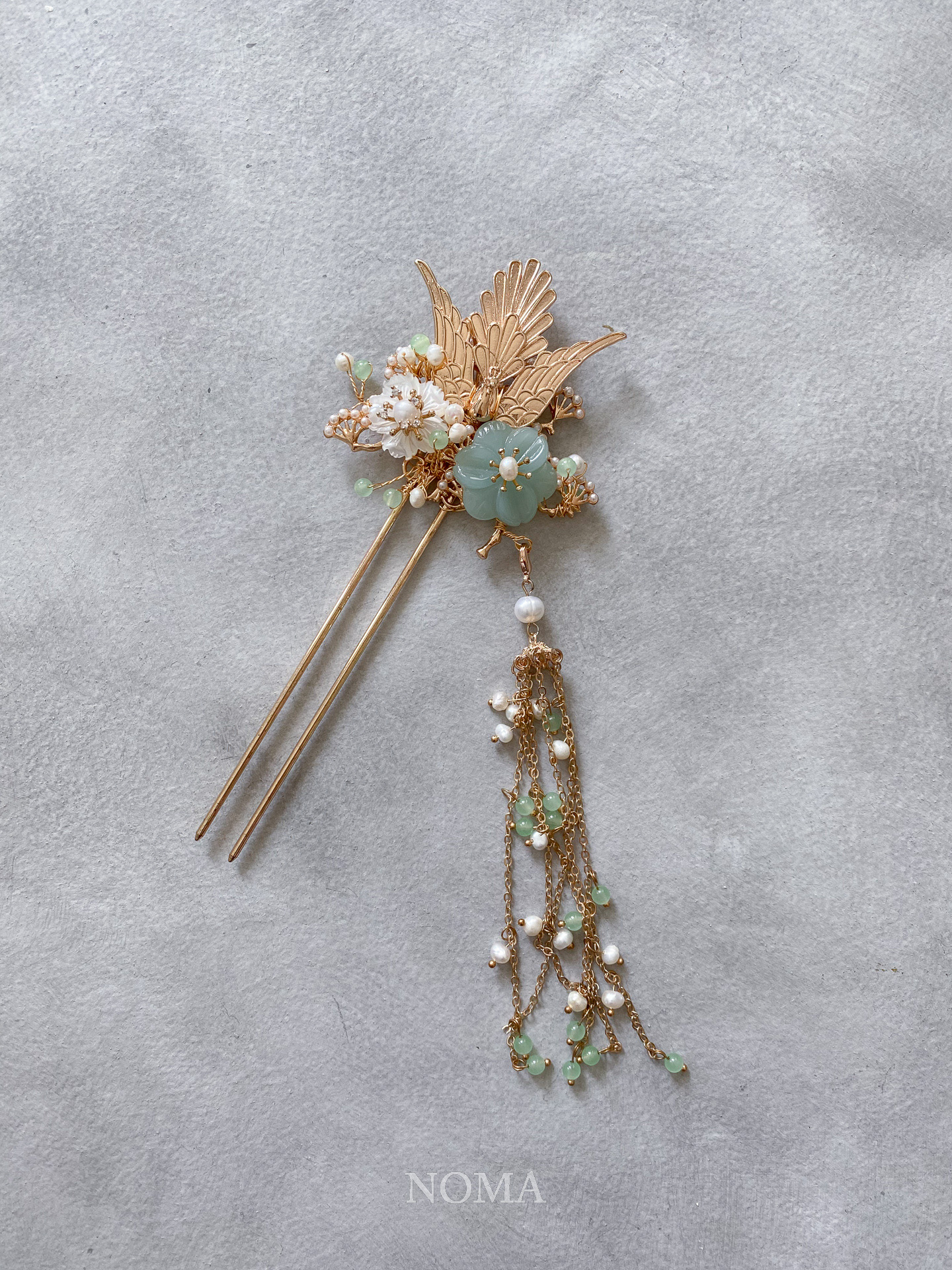 Phoenix Jade Flowers Hairpin – Gold (Left)