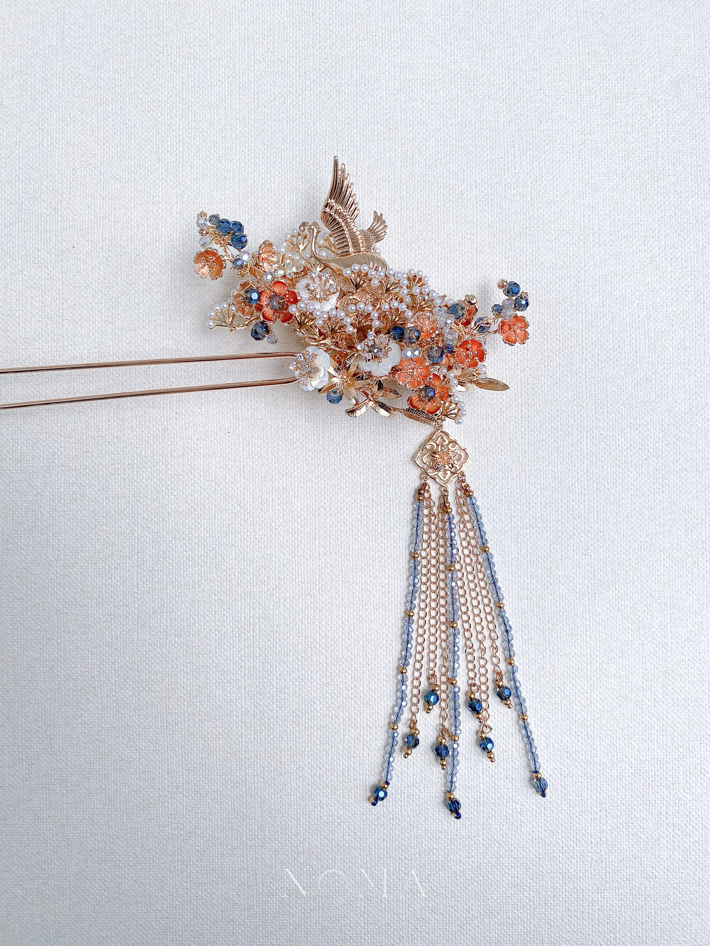 Flying Crane Pearl Blossom Hairpin – Gold, Blue (Left)