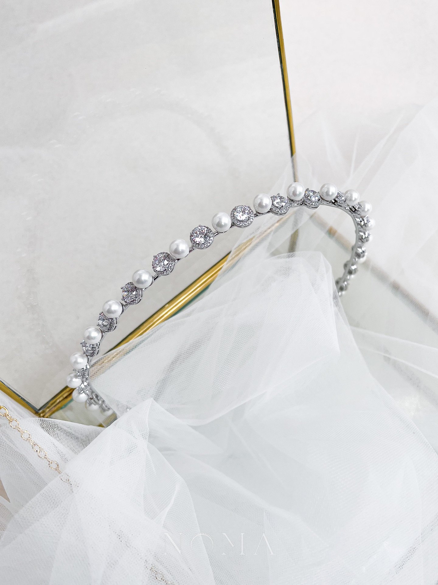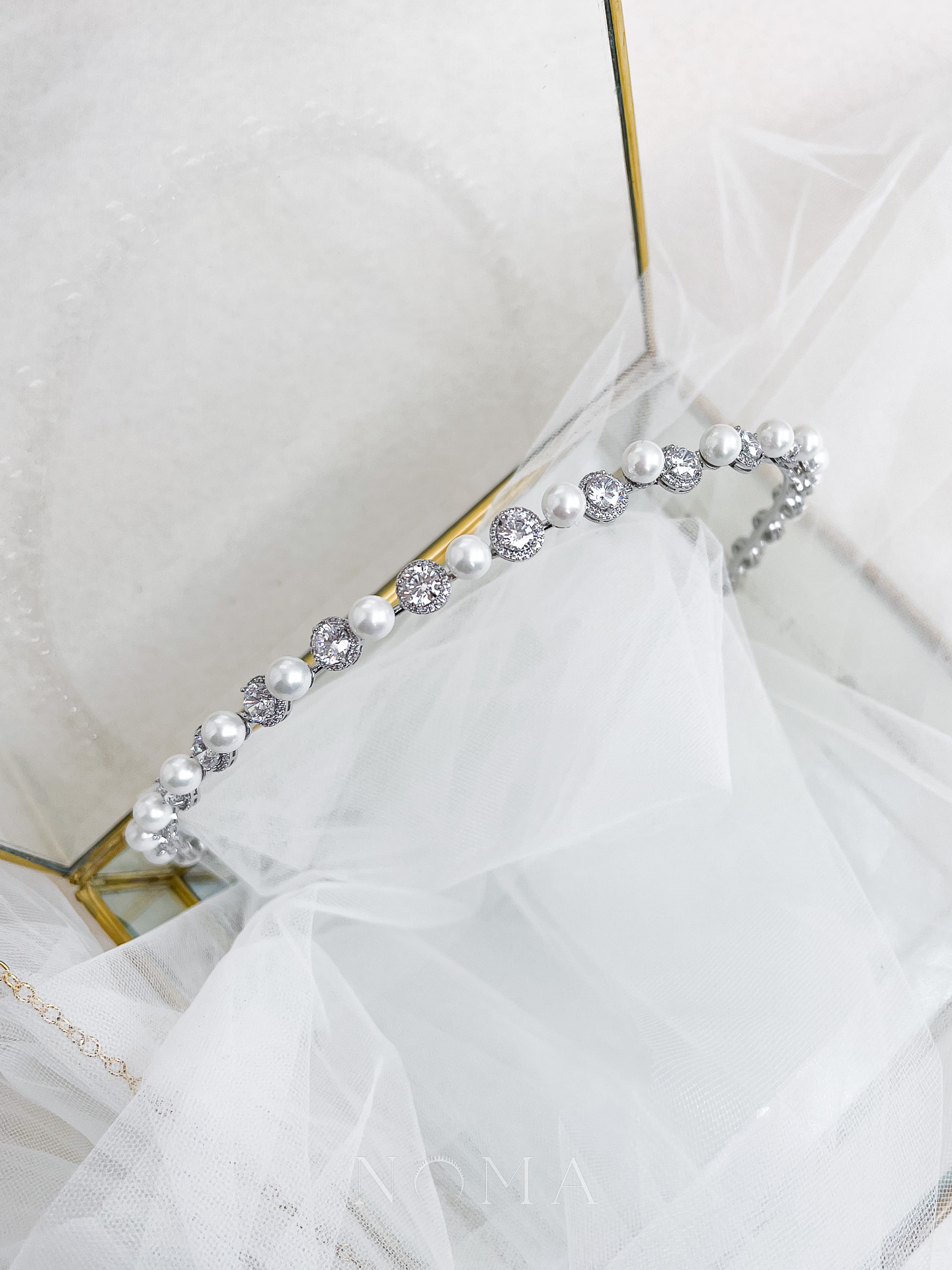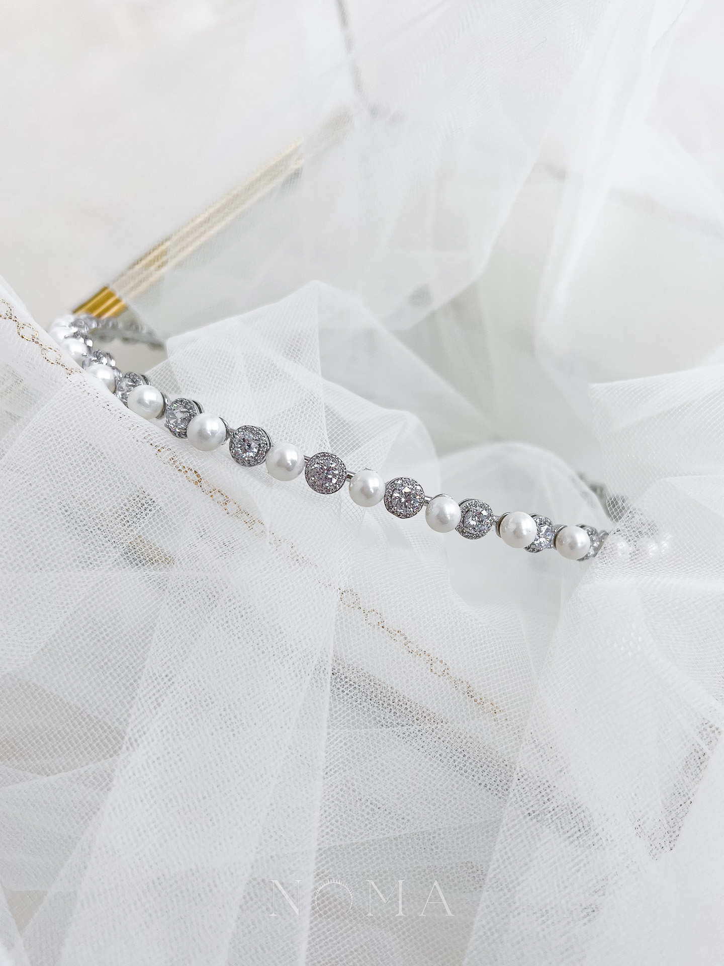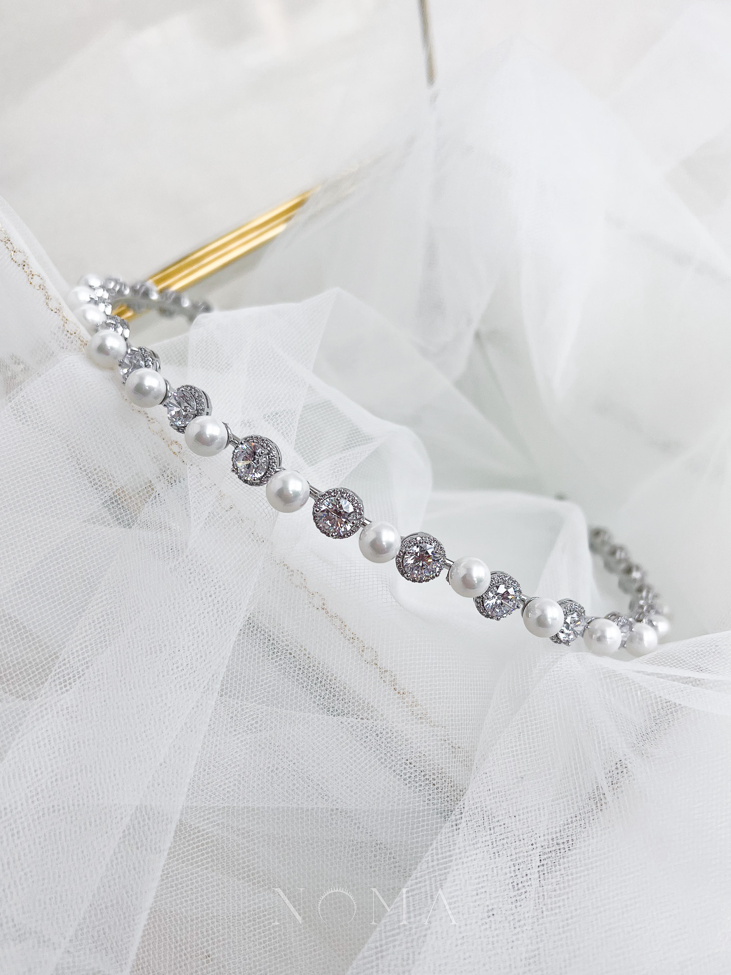 Round Halo Small Pearl Headband – Rhodium White Gold, White Pearl