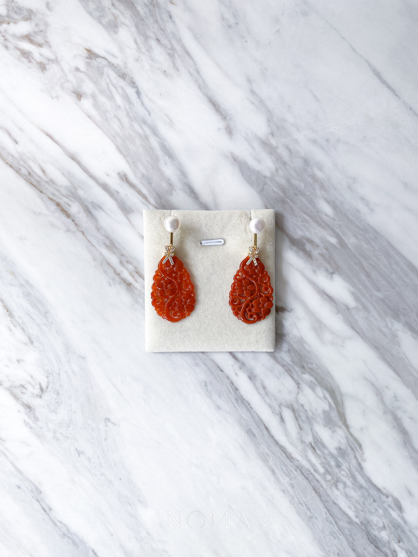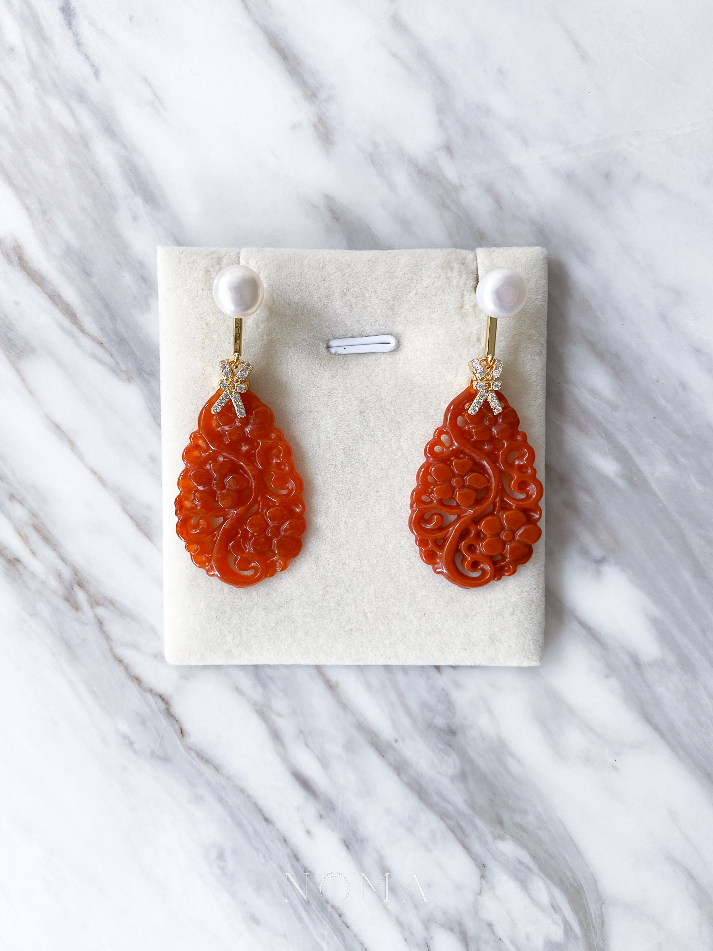 Carved Floral Teardrop Small Jade with Pearl Earrings – 18k Yellow Gold, Red