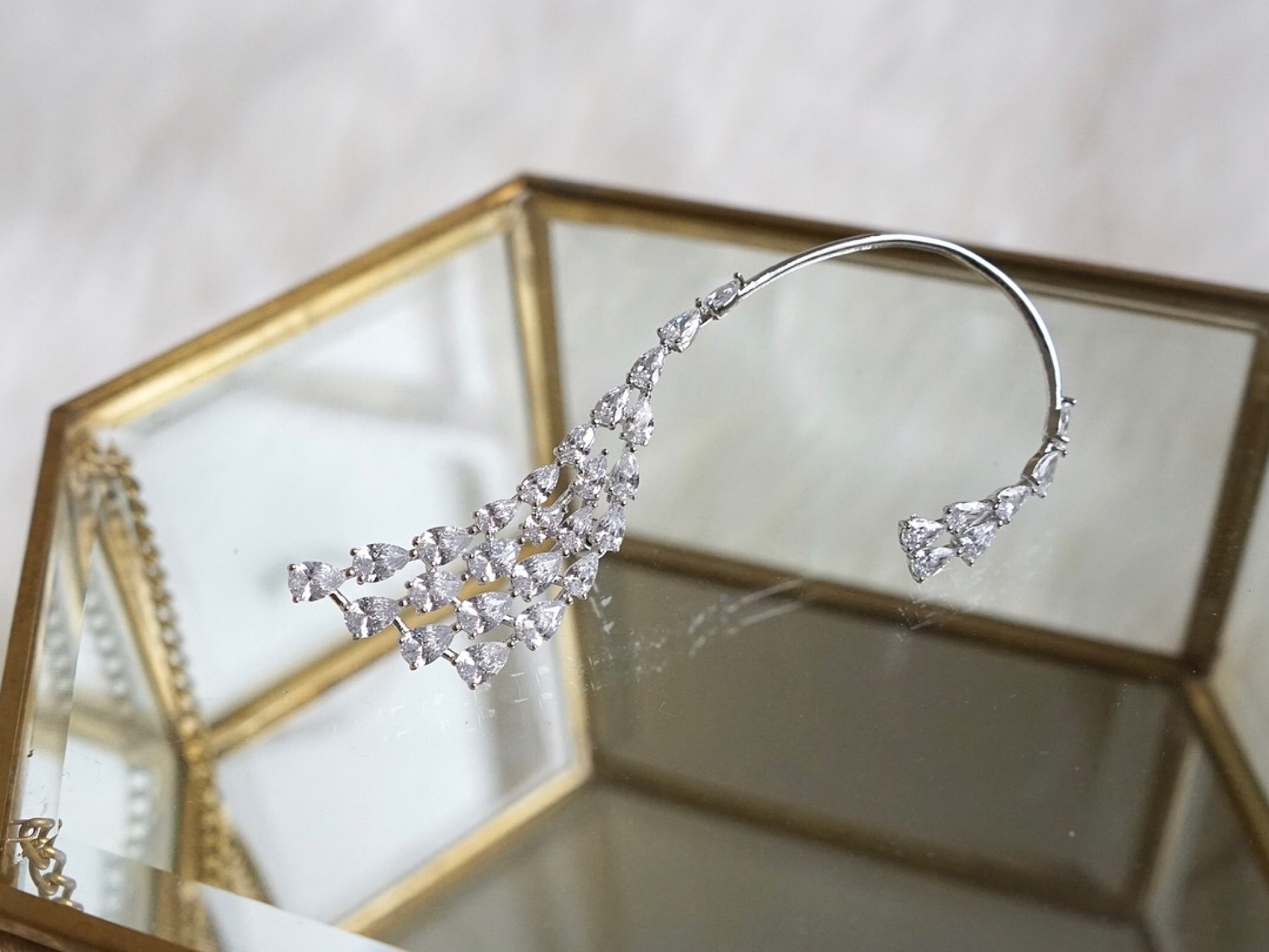 – Made with simulated diamonds with cutting and clarity comparable to real diamonds (D color), providing better shine than traditional cubic zirconia stones or Swarovski crystals.